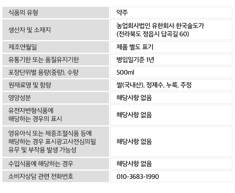 | 상호/대표자 | 농업회사법인 유한회사 한국술도가 / 강문찬 | 사업장 소재지 | 전라북도 정읍시 답곡길 60 (쌍암동) |